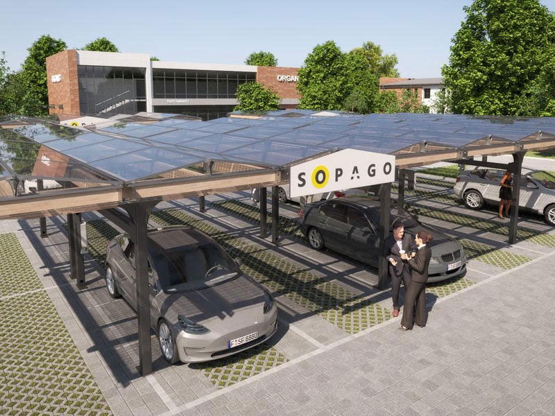 (Solar-Carport-Systeme) Für Großparkplätze ab 35 Stellplätzen hat Sopago ein modulares Solar-Carport-System entwickelt, das an die Bedürfnisse von Industrie, Handel und Kommunen angepasst werden kann. Das System ermöglicht es, den Solarstrom dort zu erzeugen, wo er benötigt wird. Mit der Stahl-Holz-Konstruktion und semitransparenten Solarmodulen fügt sich das Solar-Carport-System gut in seine Umgebung ein, wobei der Fokus auf Nachhaltigkeit liegt. Mehr